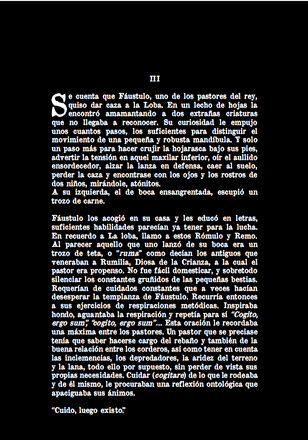 señalaría una relación activa hacia el modo de poner algo en un lugar, dis- (de arriba abajo), en un orden concreto, un estar bien puesto para la producción de algo. Un dispositivo sería entonces el mecanismo que procura una acción prevista. Pongamos por ejemplo el uso del mito para esclarecer verdades más allá de la razón, hechos de naturaleza incierta, como el origen del universo o como las oscuras vicisitudes sobre las cuales se derrama este escrito. Dispongamos en estas hojas los hechos fundacionales que dieron a luz a la ciudad de Roma y ensombrecieron aquel otro lugar que un día se llamo Remoria.